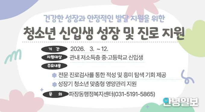 안녕일보 배윤 기자 | 수원시 장안구 파장동은 진로탐색 기회가 부족한 저소득층 청소년을 위해 ‘청소년 신입생 성장·진로 지원사업’을 추진한다고 밝혔다.