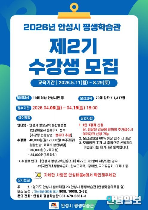 안녕일보 배윤 기자 | 안성시는 시민의 배움 기회를 확대하고 평생학습 참여를 활성화하기 위해 '2026년 평생학습관 제2기 프로그램' 수강생을 모집한다.