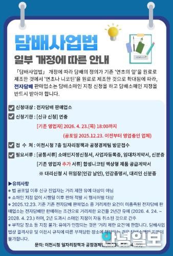 시 관계자는 “전자담배 판매업소도 담배소매인 지정 대상에 포함되는 만큼 기한 내 신청해 불이익을 받는 일이 없도록 유의해 주시기 바란다”라며 “앞으로도 제도 변경 사항을 정확히 안내해 제도가 안정적으로 정착되도록 지원하겠다”라고 말했다.