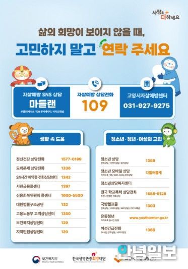 안녕일보 배윤 기자 | 고양특례시 고양시자살예방센터는 자살 예방을 위한 집중 관리와 홍보 활동을 본격 추진한다고 7일 밝혔다.