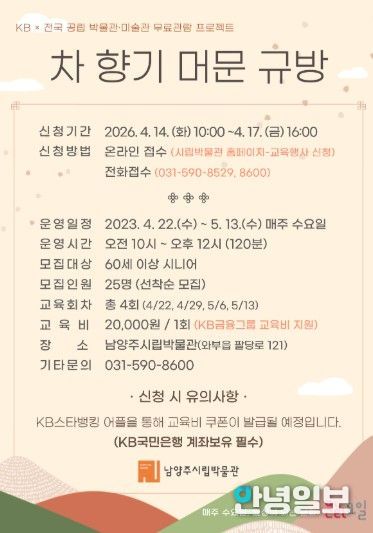 안녕일보 배윤 기자 | 남양주시는 오는 22일부터 남양주시립박물관이 시니어 대상 체험 프로그램 ‘차 향기 머문 규방’ 운영하고, 이에 앞서 14일부터 참여 신청을 받는다고 7일 밝혔다.