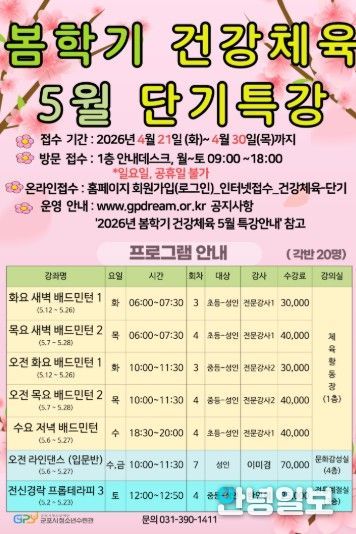 이번 건강체육 5월 단기특강은 청소년과 시민의 건강 증진 및 여가활동 활성화를 위해 마련됐으며, 배드민턴, 라인댄스, 프롭테라피 등 총 7개 강좌로 구성된다.