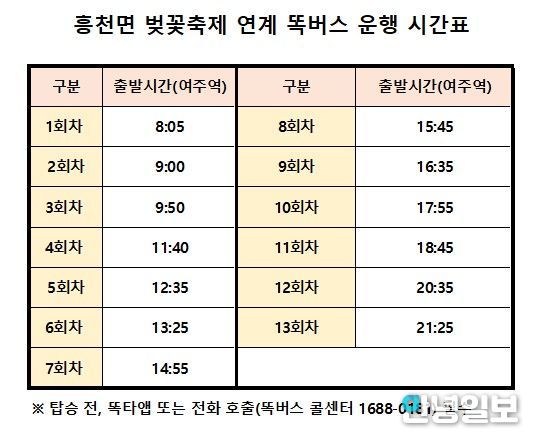 이충우 여주시장은 “흥천 남한강 벚꽃축제는 매년 수많은 인파가 몰리는 여주의 대표 축제인 만큼, 방문객들이 교통 불편 없이 축제를 즐길 수 있도록 특별 운행을 마련했다.”며, “특히 여주역에서 바로 연결되는 똑버스를 편리하게 이용해 즐거운 봄나들이 즐기시길 바란다”고 전했다.