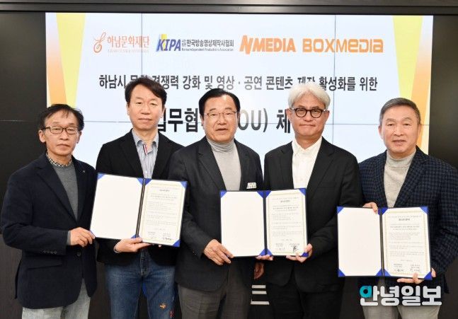 안녕일보 배윤 기자 | 하남문화재단이 4월 7일 (사)한국방송영상제작사협회(KIPA), ㈜앤미디어, ㈜박스미디어와 각각 업무협약(MOU)을 체결했다. 이번 협약식에는 이현재 하남문화재단 이사장, 이교욱 대표이사를 비롯한 각 기관 관계자들이 참석했다.