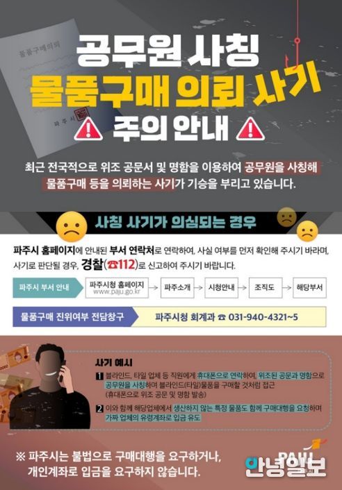 안녕일보 배윤 기자 | 파주시는 최근 전국적으로 확산 중인 공무원 사칭 사기 전화(보이스 피싱) 및 공문서 위조를 동반한 물품구매 사기 시도가 지속적으로 발생함에 따라, 관내 납품업체와 시민 피해 예방을 위해 각별한 주의를 당부했다.