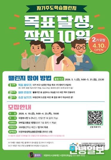 안녕일보 배윤 기자 | 의정부도시교육재단은 시민의 일상 속 학습 실천을 응원하는 의정부시민대학 시민LAB 자기주도학습챌린지 ‘목표달성, 작심 10일’ 2기 참여자를 모집한다고 밝혔다.