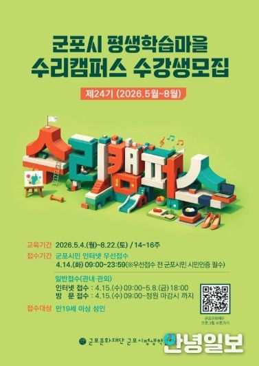 안녕일보 배윤 기자 | 군포문화재단은 오는 4월 14일부터 군포시평생학습마을 제24기(2026년 5월~8월) 수리캠퍼스 수강생을 모집한다고 밝혔다.