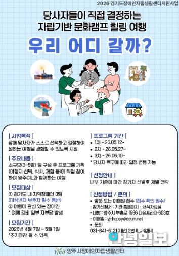 안녕일보 배윤 기자 | 양주시장애인자립생활센터에서는 장애인 당사자가 직접 선택하고 결정하는 자립 기반 힐링 여행을 목적으로 하는 지역 장애인 문화캠프 [우리 어디 갈까?] 참가자를 모집한다.