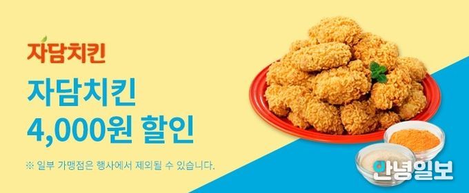 치킨은 4월 배달특급에 신규 입점한 꾸부라꼬숯불치킨을 비롯해 부어치킨, 치킨플러스, 땅땅치킨, 호식이두마리치킨, 기영이숯불두마리치킨, 해두리치킨, 누구나홀딱반한닭, 자담치킨 9곳에서 회원 전용 3~5천 원 할인 쿠폰을 발급한다.