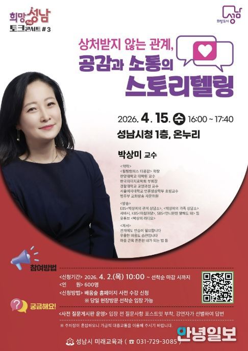 안녕일보 배윤 기자 | 성남시는 오는 4월 15일 오후 4시 시청 1층 온누리에서 ‘상처받지 않는 관계, 공감과 소통의 스토리텔링’을 주제로 한 명사 초빙 강연을 연다.