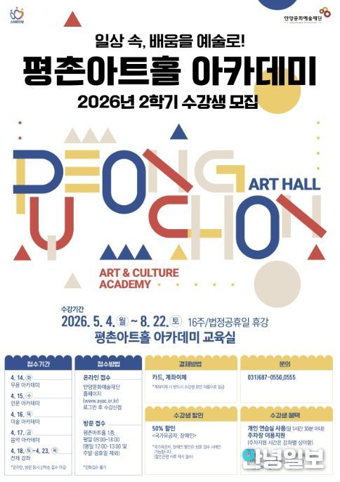 안녕일보 배윤 기자 | 안양문화예술재단은 시민 누구나 문화예술을 자유롭게 접하고 즐겁게 배울 수 있도록 오는 4월 14일부터 23일까지 ‘2026년 평촌아트홀 아카데미’ 2학기 수강생을 모집한다.