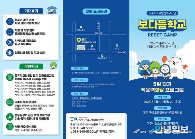 안녕일보 배윤 기자 | 파주시가 심리·정서적 이유로 학업에 어려움을 겪는 학생들의 심리 안정과 건강한 학교생활 복귀를 돕기 위해 교육발전특구 시범사업인 ‘보다듬학교’를 본격적으로 운영하며, 핵심 프로그램인 ‘리셋캠프(Reset Camp)’참여자를 모집한다.