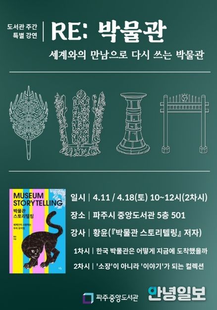 안녕일보 배윤 기자 | 파주중앙도서관은 도서관 주간을 맞아 오는 4월 11일과 18일 토요일 10시, 특별 강연 ‘리(RE): 박물관-세계와의 만남으로 다시 쓰는 박물관’을 운영한다.