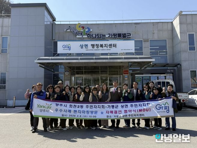 안녕일보 배윤 기자 | 양주시 회천2동 주민자치회는 지난 8일 주민자치회 활성화를 위해 가평군 상면을 방문해 벤치마킹을 실시하고 자매결연 협약을 체결했다.