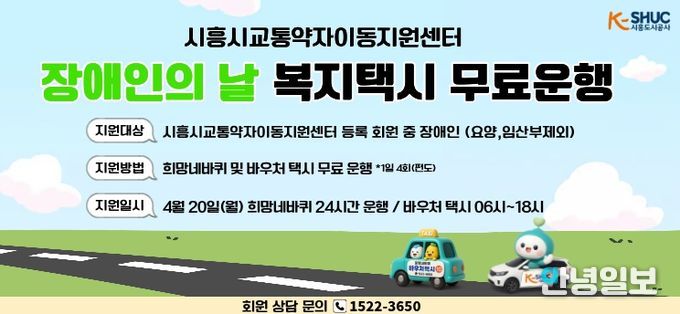 안녕일보 배윤 기자 | 시흥도시공사는 오는 4월 20일 ‘제46회 장애인의 날’을 맞아 교통약자의 이동 편의 증진과 사회참여 확대를 위해 무료 운행 서비스를 제공한다고 밝혔다.