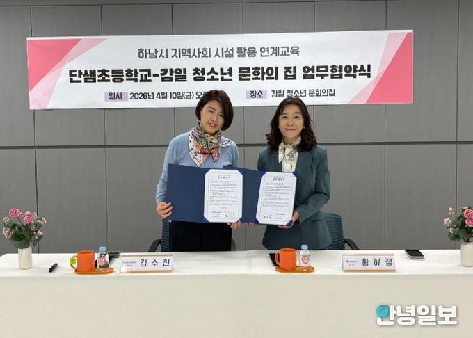 안녕일보 배윤 기자 | 단샘초등학교는 4월 10일 감일 청소년 문화의 집과 학생 체험활동 확대 및 지역 연계 교육 강화를 위한 업무협약(MOU)을 체결했다고 밝혔다. 이번 협약은 학교와 지역사회 기관 간 협력을 통해 학생들에게 보다 다양한 교육 기회를 제공하고, 안전하고 의미 있는 체험 공간을 마련하기 위해 추진됐다.