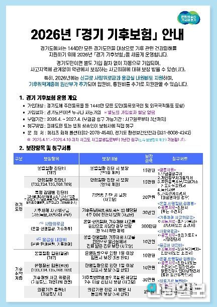 안녕일보 배윤 기자 | 경기도가 진단비를 최대 두 배 인상하고, 사망위로금을 신설하는 등 보장 혜택을 대폭 강화한 ‘2026년 경기 기후보험’을 시작했다고 13일 밝혔다.