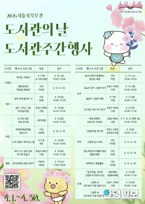안녕일보 배윤 기자 | 시흥시 북부권 공공도서관은 4월 12일 ‘도서관의 날’과 4월 12일부터 18일까지 이어지는 ‘도서관주간’을 기념해 다양한 독서문화 행사와 현장 참여 이벤트를 4월 한 달간 운영한다.