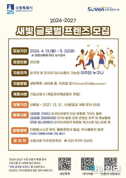 안녕일보 배윤 기자 | 수원특례시가 ‘2026~2027 수원 방문의 해’를 맞아 5월 22일까지 수원시를 전 세계에 알릴 ‘새빛 글로벌 프렌즈’를 모집한다.