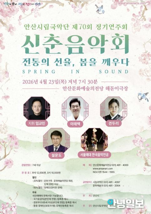이민근 안산시장은 “이번 정기연주회는 전통 국악의 깊이와 대중음악의 친숙함을 봄의 정취와 함께 담아 남녀노소 누구나 즐길 수 있도록 기획했다”며 “시민 여러분이 공연과 함께 따뜻한 봄의 기운을 느끼며 즐거운 시간을 보내시길 바란다”고 말했다.
