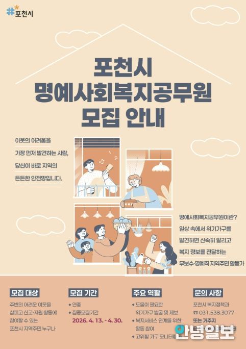 안녕일보 배윤 기자 | 포천시는 복지사각지대 해소와 위기이웃 발굴을 위해 ‘명예사회복지공무원’을 오는 30일까지 집중 모집한다.