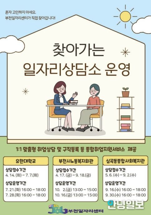 부천시 일자리정책과장은 “찾아가는 일자리상담소 운영으로 구직자의 시간적·공간적 제약을 해소하고 상담 접근성을 높일 계획”이라며 “수요자 중심의 맞춤형 취업 지원을 통해 실질적인 취업 성과로 이어지길 기대한다”고 말했다.