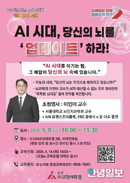 안녕일보 배윤 기자 | 오산시는 오는 5월 8일 오전 10시 오산AI코딩에듀랩에서 『AI시대, 당신의 뇌를 ‘업데이트’하라!』를 주제로 명사 초청 디지털 AI 시민 특강을 개최한다고 밝혔다.