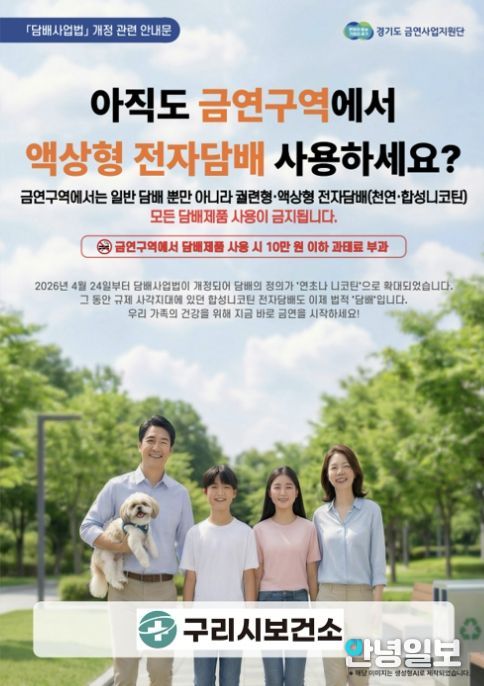 안녕일보 배윤 기자 | 구리시 보건소는'담배사업법' 및 '국민건강증진법' 개정으로 담배의 정의가 확대됨에 따라, 지역사회 내 담배 규제 사항을 점검하고 금연 문화를 확산하기 위해 4월 24일부터 금연 구역 점검·단속과 금연 홍보 운동을 한다고 밝혔다.