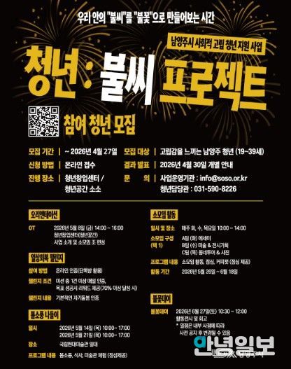안녕일보 배윤 기자 | 남양주시는 13일 사회적 고립 청년의 일상 회복과 관계 형성을 지원하는 ‘청년:불씨 프로젝트’ 참여자를 오는 27일까지 모집한다고 밝혔다.