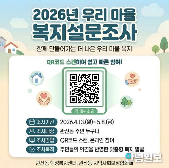 복지욕구조사는 관산동 주민을 대상으로 4월 13일부터 5월 8일까지 진행되며, 온라인 설문(QR코드) 또는 관산동 행정복지센터 방문을 통한 서면 참여 방식으로 누구나 쉽게 참여할 수 있다.