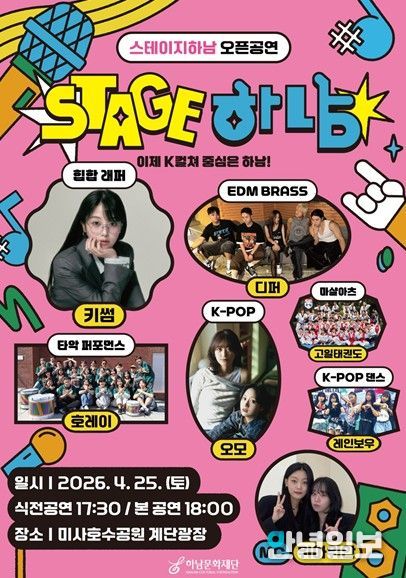 안녕일보 배윤 기자 | 하남시와 하남문화재단이 추진하는 대표 문화공연 ‘2026 스테이지 하남!’이 오는 4월 25일 미사호수공원 계단광장에서 오픈공연을 열고 올해 운영의 본격적인 시작을 알린다.
