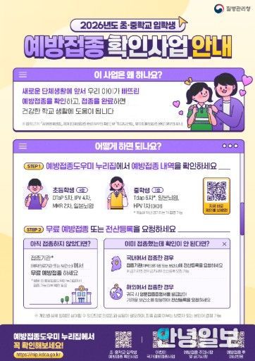 안녕일보 배윤 기자 | 김포시는 13일, 2026학년 초·중학교 입학생을 대상으로 ‘예방접종 확인 사업’을 추진한다고 밝혔다. 이번 사업은 필수 예방접종 완료 여부를 확인하고 미접종자 및 접종이 지연된 학생에 대해 접종을 독려하기 위해 실시된다. 특히 단체생활을 시작하는 입학생 시기에 예방접종을 완료하도록 함으로써 감염병의 학교 내 확산을 사전에 차단하는 데 목적이 있다.