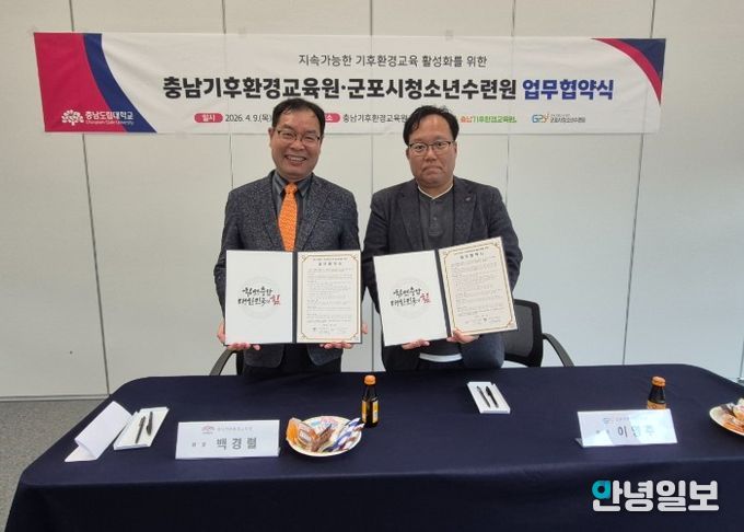 안녕일보 배윤 기자 | (재)군포시청소년재단이 운영하는 군포시청소년수련원(충남 청양)과 충남기후환경교육원(충남 청양)은 4월 9일, 미래세대의 지속가능 기후환경교육 활성화를 위한 업무협약을 체결했다고 전했다.