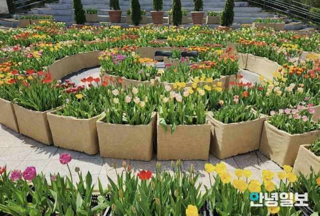 이번 화단은 튤립 구근을 상자 식재 방식으로 심은 튤립상자를 활용해 원형 동선을 따라 미로처럼 걸을 수 있도록 조성한 것이 특징이다. 방문객들은 미로 길을 따라 이동하며 꽃을 가까이에서 감상할 수 있고, 여러 색의 튤립이 어우러진 화단에서 한층 화려하고 풍성한 봄 풍경을 즐길 수 있다.