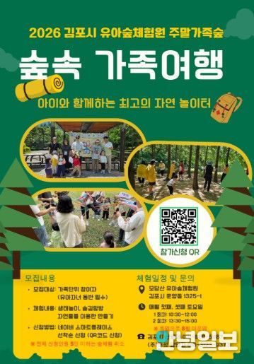 안녕일보 배윤 기자 | 김포시는 4월 18일부터 ‘유아숲체험원 주말 가족숲 프로그램’을 본격적으로 운영한다고 밝혔다. 이번 프로그램은 유아의 자연 친화적 성장과 가족 단위 체험 기회를 확대하기 위해 마련됐다.