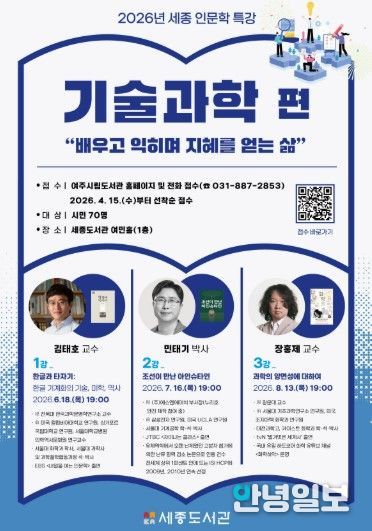 안녕일보 배윤 기자 | 여주시는 오는 6월 18일부터 8월 13일까지 세종도서관에서 '2026년 세종 인문학 특강'‘기술과학 편’을 3회 운영한다.