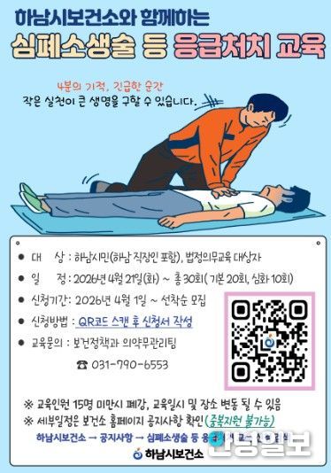 안녕일보 배윤 기자 | 하남시보건소는 시민의 응급상황 대응 능력을 강화하고 안전한 지역사회 환경을 조성하기 위해 오는 4월 21일부터 11월 3일까지 ‘2026년 심폐소생술 등 응급처치 교육’을 실시한다고 10일 밝혔다.