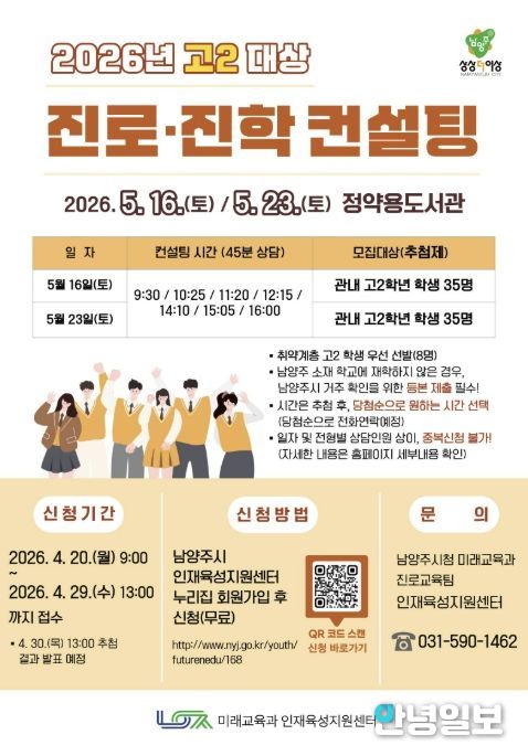 안녕일보 배윤 기자 | 남양주시는 오는 20일부터 29일 오후 1시까지 관내 고등학교 2학년 학생과 학부모를 대상으로 ‘고2 맞춤형 진로·진학 컨설팅’ 참여자를 모집한다고 15일 밝혔다.