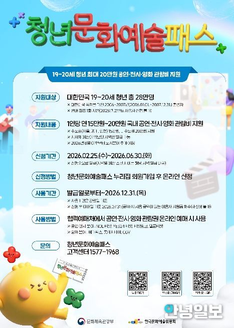 시 관계자는 “청년문화예술패스는 청년들이 다양한 공연과 전시를 부담 없이 경험하며 문화 감수성을 키울 수 있도록 마련된 사업”이라며 “신청을 미루다 혜택을 받지 못하는 사례가 발생할 수 있는 만큼 대상 청년들의 적극적인 신청을 바란다”고 말했다.