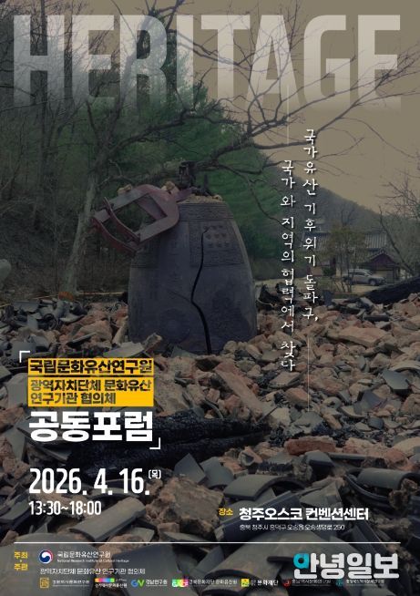 안녕일보 배윤 기자 | 경기문화재단 경기역사문화유산원은 국립문화유산연구원과 전국 7개 광역 문화유산 연구기관(경기, 강원, 충남, 충북, 경남, 경북, 전남)과 함께 오는 4월 16일 청주 오스코(OSCO)에서 ‘국가유산 기후위기 돌파구, 국가와 지역의 협력에서 찾다’를 주제로 공동포럼을 개최한다.