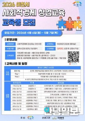 안녕일보 배윤 기자 | 이천시가 지난 4월 6일부터 5월 7일까지 사회적경제에 관심 있는 이천시민 예비창업자 30명을 2026년 이천시 사회적경제 창업교육생으로 모집한다고 밝혔다.