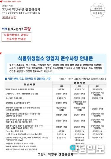 덕양구 관계자는 “이번 안내문 배부를 통해 식품위생법 주요 위반사항과 변경된 규정을 적극 안내하고, 영업자의 위생관리 역량을 높이고자 한다”며 “기온 상승으로 식중독 발생 위험이 높아지는 시기인 만큼 예방 수칙 홍보를 병행해 안전한 식품위생 환경 조성에 최선을 다하겠다”고 밝혔다.