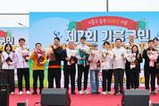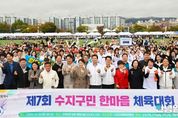 안녕일보 배윤 기자 | 용인특례시 수지구는 18일 아르피아 상부 체육시설에서 ‘제7회 수지구민 한마음 체육대회’를 개최했다. 수지구 체육연합회가 주최·주관한 이번 대회엔 구민 약 2000여 명이 참여해 승부차기, 볼풀공 바구니농구, 줄다리기, 계주 등으로 구민 모두 한마음으로 어우러지는 시간을 보냈다. 또 식전 공연인 동천동 훌라댄스, 신봉동 밸리댄스와 단국대학교 치어리딩팀 ‘아스테르’의 공연, 퓨전 장구, 보컬그룹 ‘뮤랑’, 마술사 홍승인, 초대 가수 김성환 등이 다채로운 무대를 선보였다. 행사장 곳곳에선 화분 만들기, 친환경 리필스테이션(세제 담아가기), MBTI 검사, 캘리그라피 체험, 키링 만들기, 구민 건강 서비스 안내 부스 등 체험 프로그램이 운영됐다. 이상일 시장은 “우리 수지구민들이 모처럼 한자리에 모여 우정을 나누면서 행사를 통해 행복한 시간을 많이 보내시라고 비가 그친 것 같다”며 “수지중앙공원은 축구장 76개 크기의 시민 힐링 공간으로 조성되고 있고, 상현3동 행정복지센터와 함게 건립되는 광교스포츠센터에는 25m레인 10개의 수영장이 들어서게 된다"며 "서울종합운동장역과 수서역으