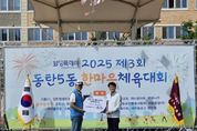 안녕일보 배윤 기자 | 지난 21일 ‘제3회 동탄5동 한마음 체육대회’가 동탄5동 체육진흥회 주관으로 다원이음터 축구장에서 성황리에 개최됐다. 이번 대회는 주민들의 화합과 소통을 통해 건강을 증진하고 공동체 의식을 다지기 위해 마련됐으며, 400여 명의 주민과 내빈들이 함께해 활기찬 분위기를 더했다. 행사는 풍물 공연과 색소폰 연주로 흥겨운 막을 올렸고, 개회식에서는 모범시민 표창 수여와 내빈들의 축사가 이어졌다. 또한, 동탄5동 체육진흥회와 감탄정형외과가 의료 지원·후원 협약을 체결해 향후 체육대회를 비롯한 다양한 동 행사에서 의료 지원과 후원을 지속하기로 약속하며 지역사회 상생의 의미를 더했다. 본 경기는 볼풀공 서바이벌, 큰 공 배구, 줄다리기 등 남녀노소가 모두 참여할 수 있는 명랑운동회 종목으로 진행돼 웃음과 열기가 가득했다. 이어진 태권도 축하공연은 참가자들에게 힘찬 에너지를 전하며 분위기를 한층 끌어올렸다. 또한 체험부스 운영과 경품 추첨 이벤트도 마련돼 가족 단위 참가자들에게 다채로운 즐길 거리를 제공했다. 풍성한 상품과 이벤트는 주민들의 큰 호응을 얻으며 축제의 열기를