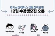 안녕일보 배윤 기자 | 경기문화재단 경기상상캠퍼스(대표이사 유정주)는 겨울 시즌 생활창작공방 프로그램 참여자를 오는 17일부터 모집한다. 생활창작공방은 경기상상캠퍼스 생생1990에 위치한 경기생활문화센터 교육 커뮤니티 공간으로, 도민이 일상 속에서 다양한 창작 활동을 경험할 수 있도록 재단공방, 어린이창작공방, 드로잉실, 취미공방, 직물공방, 커피공방, 사진촬영실까지 총 7개의 특화 공간을 운영하고 있다. 11월에는 총 11개의 프로그램이 구성돼 있으며, 주요 프로그램으로는 △Set in wool(울조끼와 가방 만들기), △오롯이 나에게 집중하는 시간: 4주 터프팅 힐링 프로젝트, △내 생애 첫 그림- 알기 쉬운 민화'일월오봉도', △그림책 마음 놀이터 등이 있다. 12월에는 △오일파스텔로 만드는 2026년 달력 △우리들의 예술놀이터, △복을 담는 라탄 복조리 만들기, △복을 쓸어 담는 모시 빗자루 만들기, △커피의 감별과 추출 방법: 커핑까지 총 5개의 프로그램이 운영될 예정이며, 수강 신청은 11월 14일부터 각 프로그램 시작 4일 전까지 경기상상캠퍼스 누리집을 통해 가능하다. 경기상상캠퍼스 내