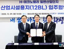 안녕일보 배윤 기자 | 화성특례시 H-테크노밸리 일반산업단지에 세계적 기업 삼성전자의 세 번째 첨단 물류거점(CDC, Central Distribution Center)이 들어선다. 시는 9일 시청 중앙회의실에서 삼성전자㈜, ㈜에이치테크노밸리와 ‘첨단 물류거점 조성을 위한 입주협약’을 체결하고, 삼성전자의 H-테크노밸리 일반산업단지 입주를 위해 상호 협력하기로 했다. 이날 협약은 삼성전자가 산업단지 내 산업시설용지(12BL) 약 6만4천㎡를 분양받기 위한 사전절차로, 화성시 및 산업단지 시행사인 ㈜에이치테크노밸리의 적극적인 노력과 삼성전자의 물류 고도화 전략이 맞물려 추진됐다. H-테크노밸리 일반산업단지는 화성시 양감면 요당리 일원에 73만 6천㎡ 규모로 조성 중인 반도체·자동차 부품 특화단지로, 현재 토지 보상을 완료하고 2028년 준공을 목표로 산업시설용지 분양과 단지 조성 공사를 진행하고 있다. 특히, 서해안고속도로 발안IC 및 평택제천고속도로 청북IC와 인접한 탁월한 교통망을 갖추고 있어, 반도체 및 미래차 소부장(소재·부품·장비) 기업들의 핵심 요충지로 떠오르고 있다. 삼성전자