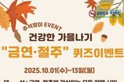 안녕일보 배윤 기자 | 평택시 송탄보건소에서 오는 10월 1일부터 13일까지 시민 누구나 참여할 수 있는 ‘건강한 가을나기 금연·절주 퀴즈 이벤트’를 진행한다. 이번 퀴즈 이벤트는 정보무늬(QR코드)를 활용 간편하게 참여할 수 있으며 금연·절주의 필요성과 건강관리 정보를 흥미로운 퀴즈 형식으로 접할 수 있도록 기획됐다. 퀴즈를 완료한 참여자 중 정답자 100명을 추첨해 금연 홍보물(보조배터리)을 증정하며 당첨자는 10월 15일 개별 문자로 안내된다. 상품은 10월 16일부터 22일까지 송탄보건소 1층 헬스케어상담센터 내 금연클리닉에서 수령할 수 있다. 송탄보건소 관계자는 “모든 시민이 금연과 절주의 필요성을 이해하고 건강한 생활을 실천하는 계기가 되길 바란다”라고 전했다.