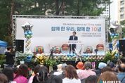 안녕일보 배윤 기자 | 고양시원흥종합사회복지관은 지난 18일, 도래울마을1단지 중앙공원에서 개관 10주년 기념행사 ‘함께한 우리, 함께한 10년’을 1,000여 명의 주민이 참여한 가운데 성황리에 마무리했다. 이번 행사는 복지관과 함께 도래울마을1단지 내에서 공동체를 이루어온 원흥도래울마을1단지관리사무소와 고양시립원흥어린이집이 협력해 준비했으며, 복지관과 함께해온 지역주민과 자원봉사자, 후원자들에게 감사의 마음을 전하고, 이웃 간 소통과 화합을 도모하기 위해 마련됐다. 다인예술단의 신나는 고고장구와 고양시립합창단의 식전 공연으로 화려하게 막을 올린 이번 행사에는 이동환 고양특례시장, 김성회 국회의원, 경기도와 고양특례시의회 의원, 유관기관 단체장 등 많은 내빈들이 참석해 축하를 전했다. 이어 진행된 표창 수여식에서는 복지관과 함께한 자원봉사자와 후원자들이 감사패를 받았으며, 비전 선포식과 후원 전달식을 통해 앞으로의 10년을 향한 새로운 다짐을 공유했다. 2부 순서에서는 복지관 프로그램 참여자들이 직접 준비한 ▲줌바댄스 ▲합창 ▲하모니카 공연 등 다채로운 무대가 펼쳐져 관객들의 뜨거운 박수를 받았다