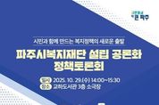 안녕일보 배윤 기자 | 파주시는 오는 29일 14시, 교하도서관 3층 소극장에서 ‘파주시복지재단 설립 공론화 정책토론회’를 개최한다고 밝혔다. 이번 토론회는 파주시복지재단 설립을 앞두고 시민, 전문가, 현장 종사자의 다양한 의견을 수렴해 재단 설립의 필요성과 발전 방향을 함께 모색하기 위해 마련됐다. 토론회는 김민철 서영대학교 사회복지행정학과 교수의 기조 강연을 시작으로, 파주시 복지기획팀장의 주제 발표가 이어진다. 이어 한지원 두원공과대학교 교수가 좌장을 맡아 토론을 진행하며, 이보경 파주시문산종합사회복지관 관장, 오민수 경기복지재단 선임연구위원, 박윤근 화성시복지재단 사업본부장 등이 참석해 열띤 논의를 펼칠 예정이다. 토론에서는 ▲파주시복지재단 설립의 필요성과 추진 개요 ▲파주시 여건을 반영한 복지재단의 발전 방향 ▲재정 자립 및 지속가능성 확보 방안 등 다양한 주제가 심도 있게 논의될 예정이다. 김은숙 복지정책국장은 “파주시복지재단은 시민의 삶을 보다 세밀하게 지원하고, 지역 현장의 목소리를 반영한 ‘파주형 복지모델’을 실행할 구심점이 될 것”이라며, “이번 토론회를 통해 파주시 복지 정책의