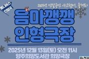 안녕일보 배윤 기자 | 양주희망도서관이 오는 13일 도서관 내 희망극장에서 국악 사물놀이를 기반으로 한 인형극 '음마깽깽 인형극장'을 운영한다. '음마깽깽 인형극장'은 연말을 맞아 한 해를 마무리 할 수 있는 주제로 ‘수고했어, 올해도’로 기획됐다. 지난달 29일 약 80여 명의 관객과 함께한 천 개의 캔들 음악회에 이은 두 번째 시간이다. 특히 이번 공연은 경기아트센터의 “찾아가는 문화복지공연” 사업으로 지역 시민들에게 수준 높은 문화예술 향유의 기회를 제공하고자 마련됐다. 본 공연을 펼쳐 줄 ‘음마깽깽 연희극장’팀은 국가중요무형문화재로 지정된 전통 인형극인 ‘덜미’를 중심으로 국악과 인형극을 접목하여, 국내 유일한 남사당놀이 극을 진행하는 팀이다. 이번 공연은 3가지 막으로 구성된 옴니버스 형식의 인형극으로 펼쳐진다. 관람 신청은 도서관 누리집에서 선착순으로 가능하며, 양주시민이면 누구나 무료로 관람할 수 있다. 도서관 관계자는 “연말을 맞아 도서관에서 함께하는 공연을 통해 올해 고생한 서로를 위로하며 한 해를 잘 마무리하는 시간이 되길 기대한다”고 전했다.